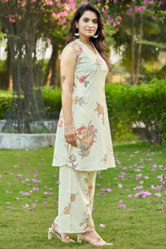 Cream Embroidered Neck Vatican Kurti Set with Organza Butti Dupatta