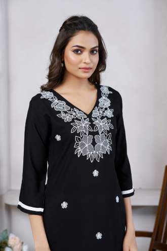 Navy Blue Rayon Kurti Set with Floral Embroidery & Organza Butti Dupatta