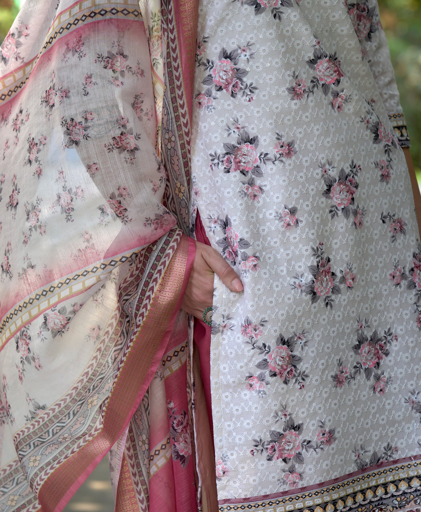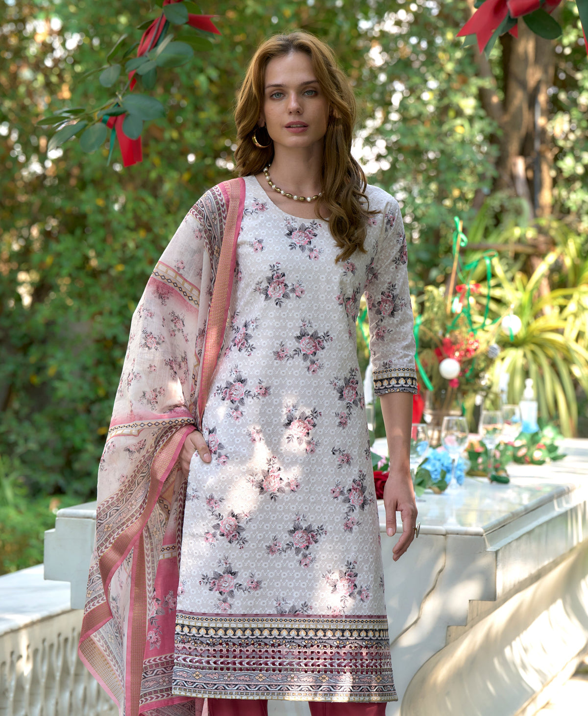 Pink Cotton Floral & Leaf Straight Kurti Set