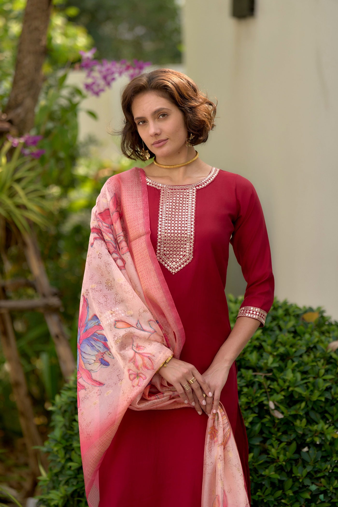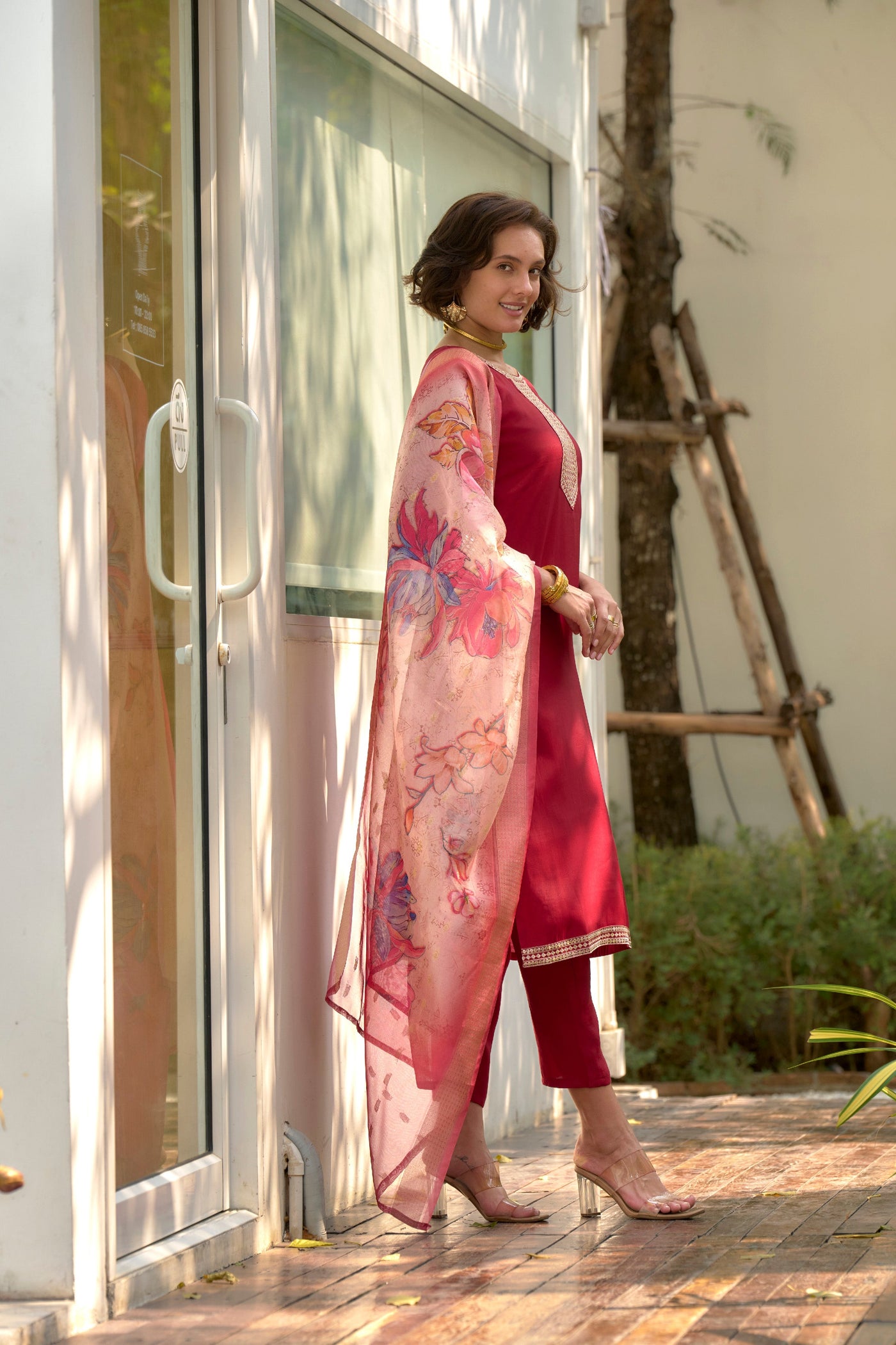Red Roman Kurti Set with 3/4 Sleeves and Organza Jacquard Printed Dupatta with Pocket Pant