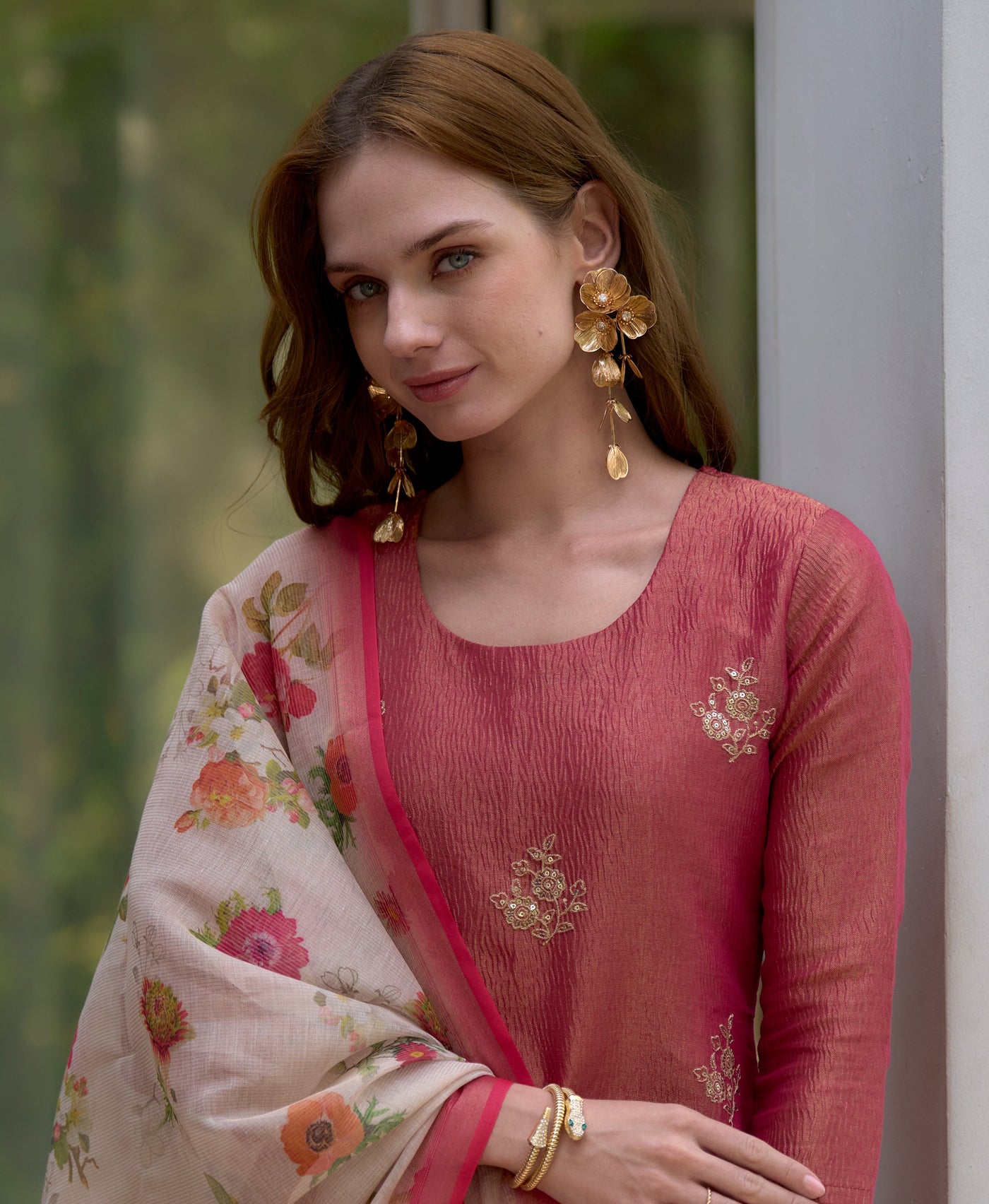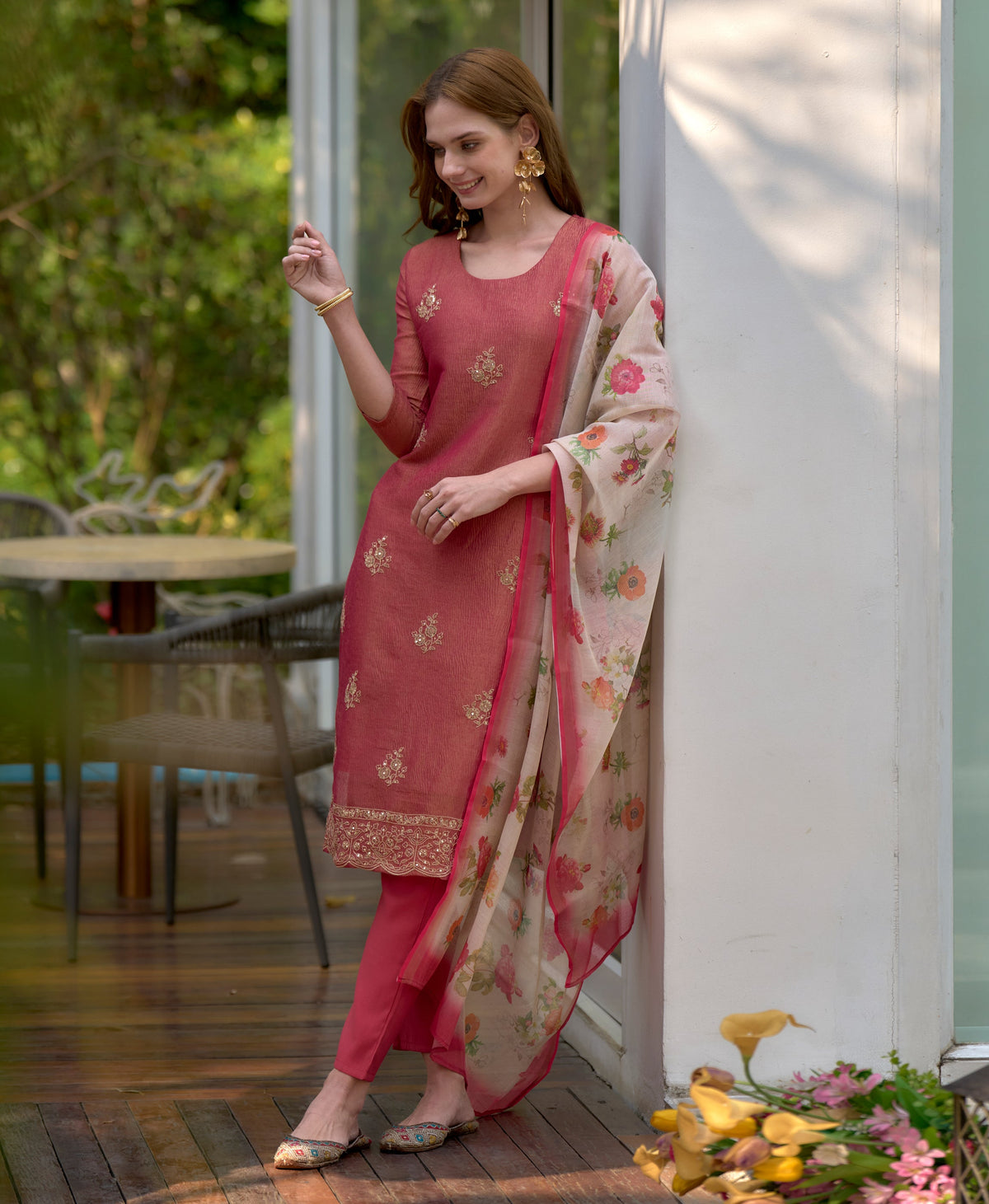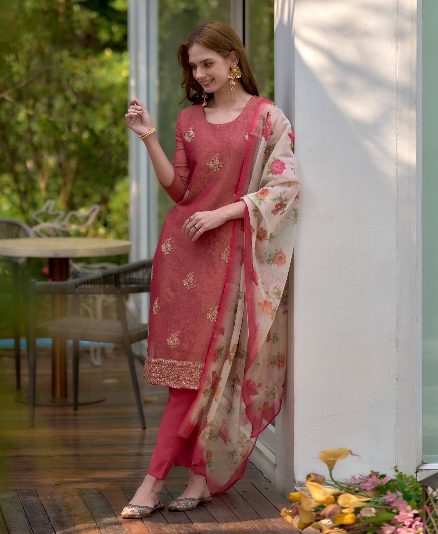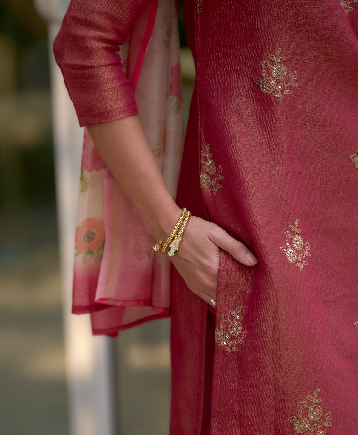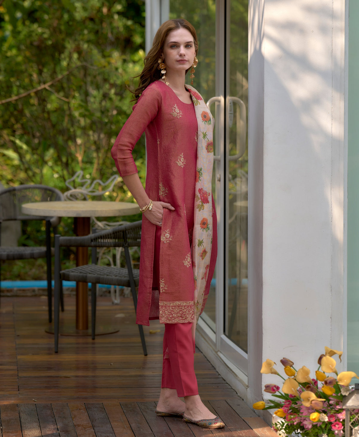 Red Tissue Silk Embroidered Straight Kurti Set - S