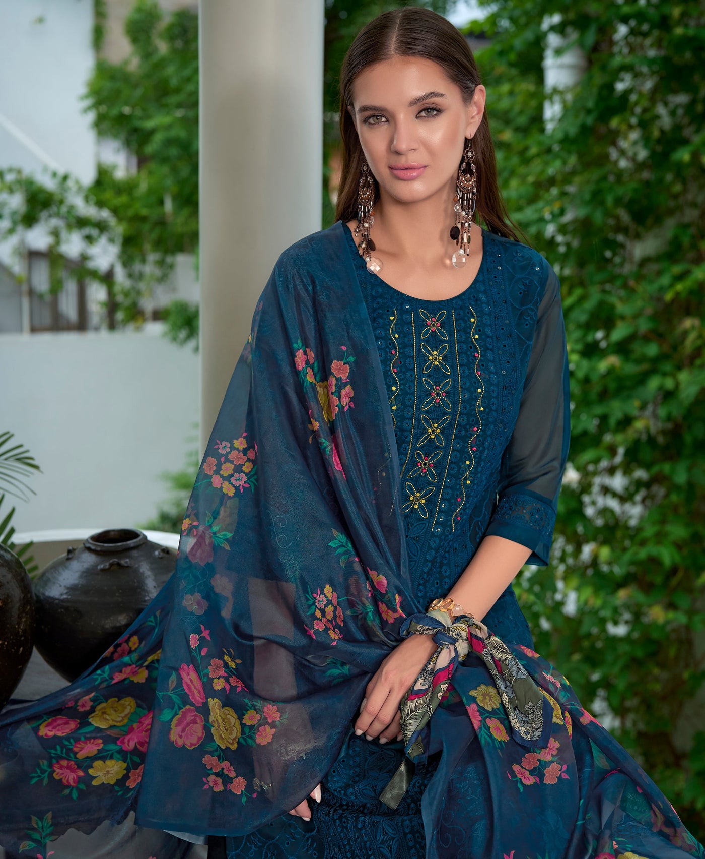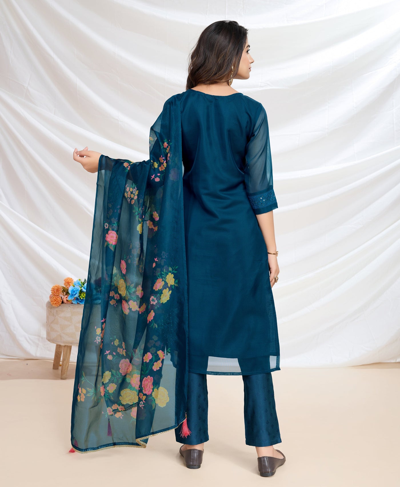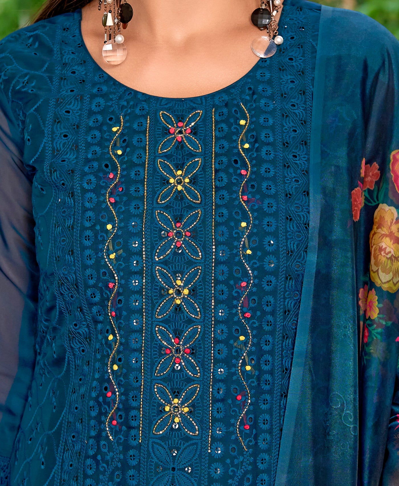 Teal Blue Organza Bored Schiffli Embroidered Straight Kurta Set