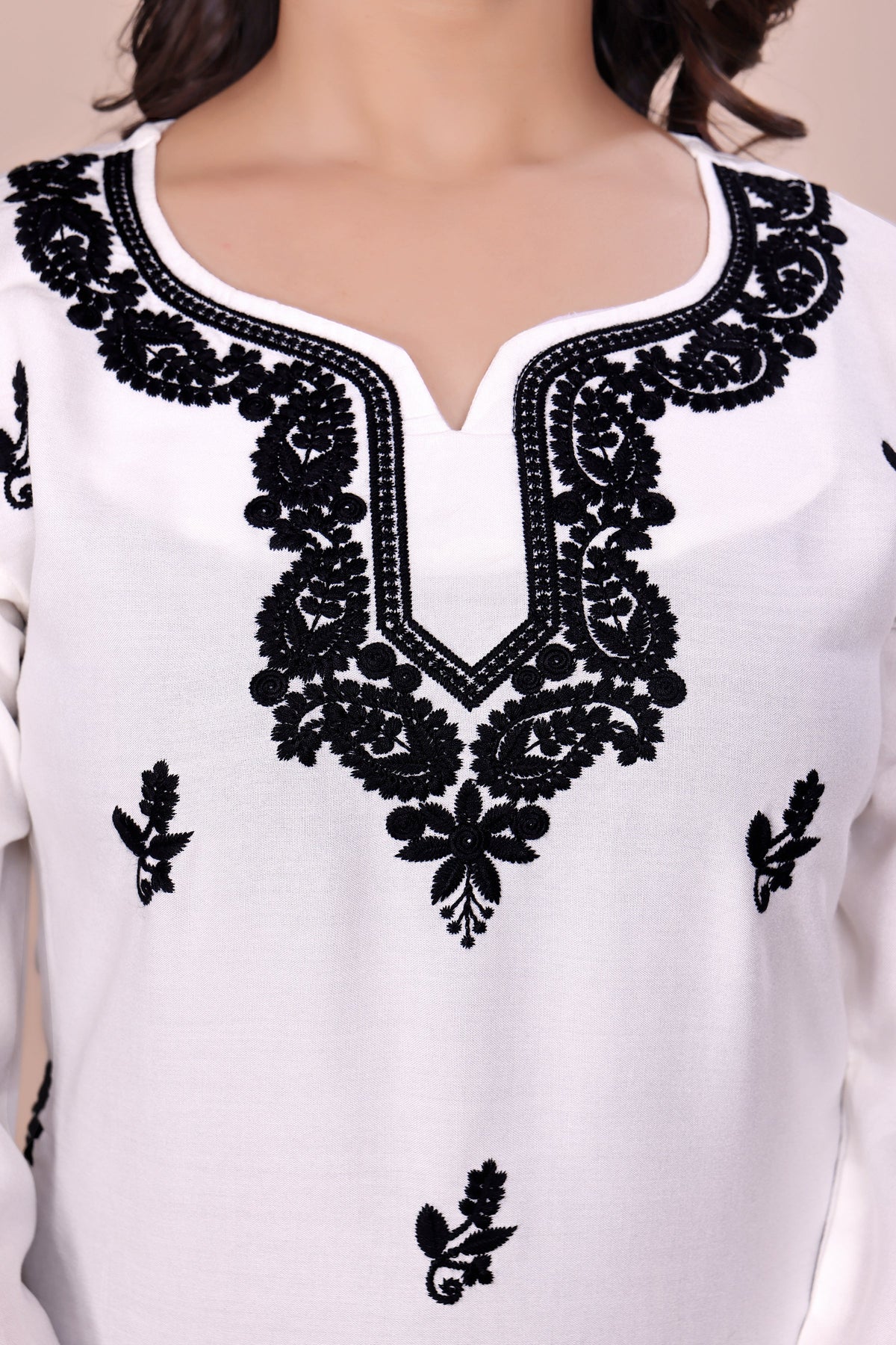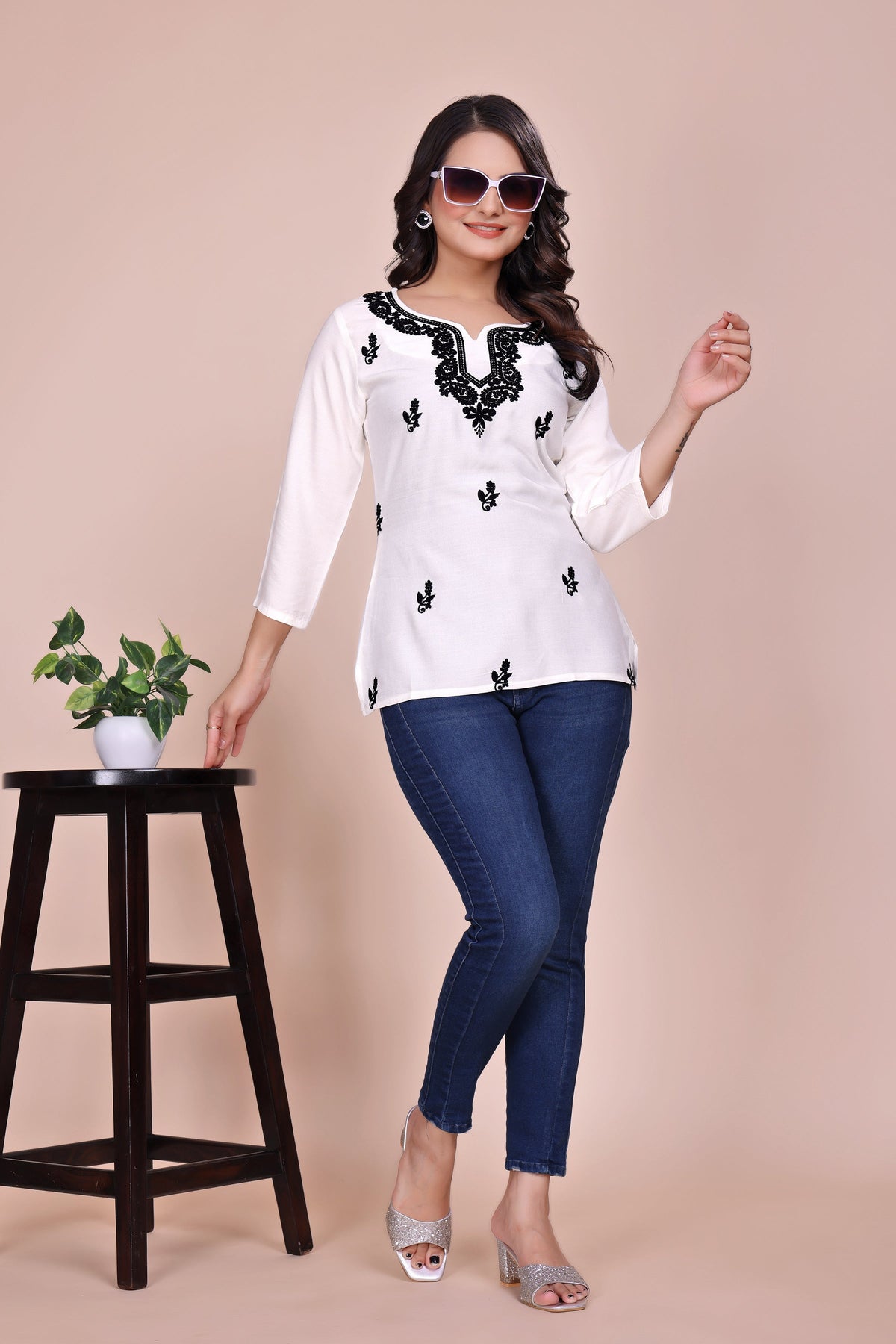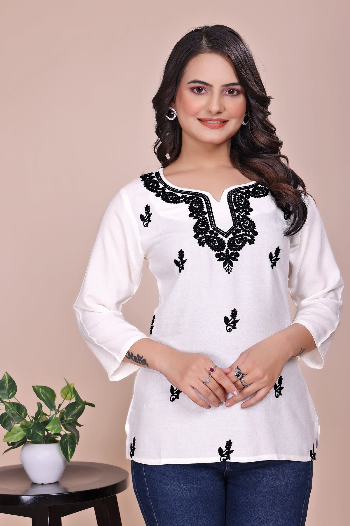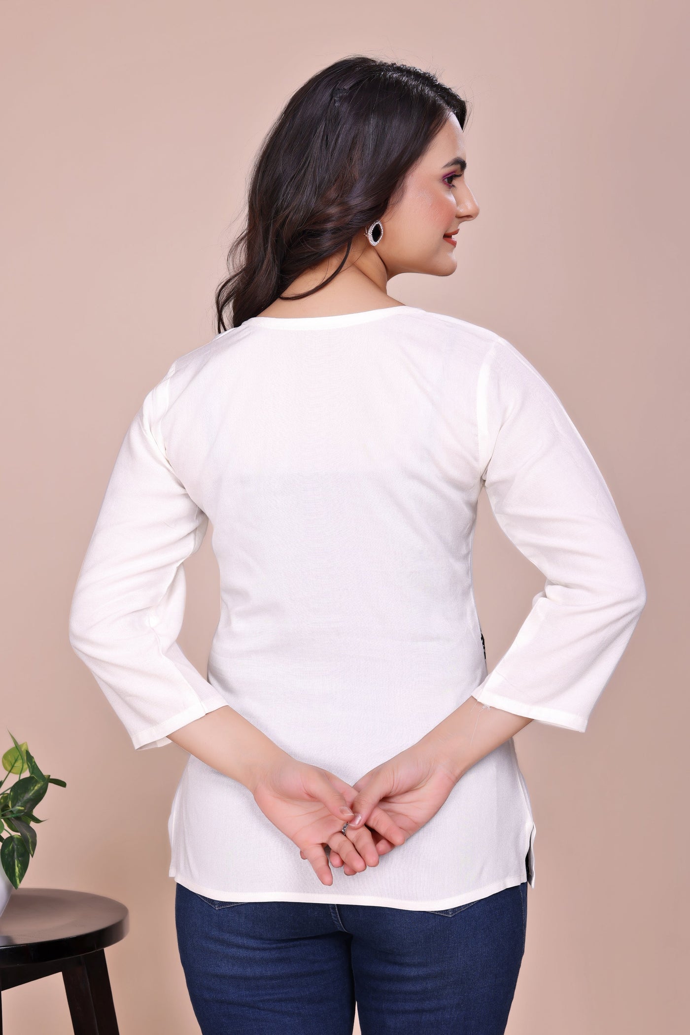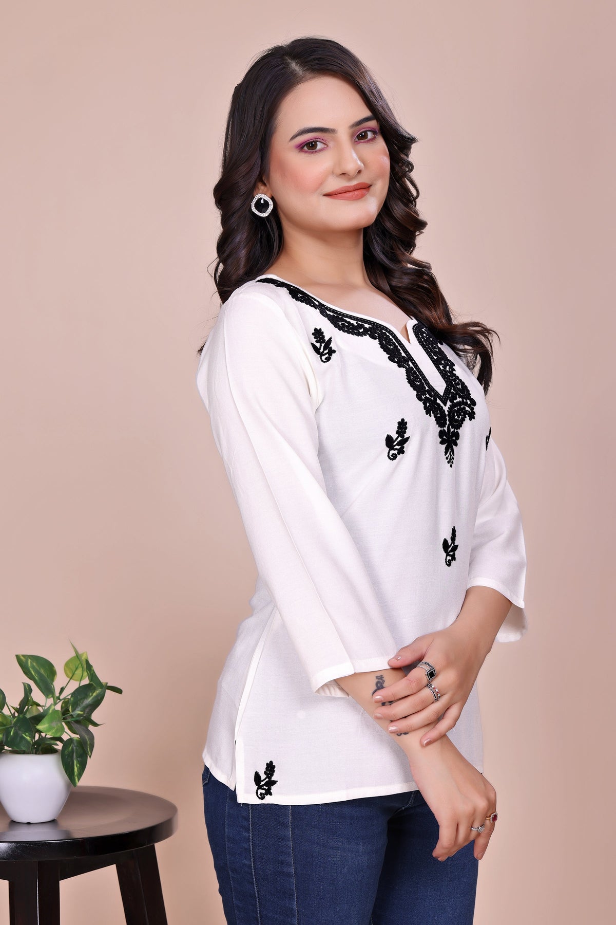 White Viscose Rayon Embroidered Tunic with 3/4 Sleeves
