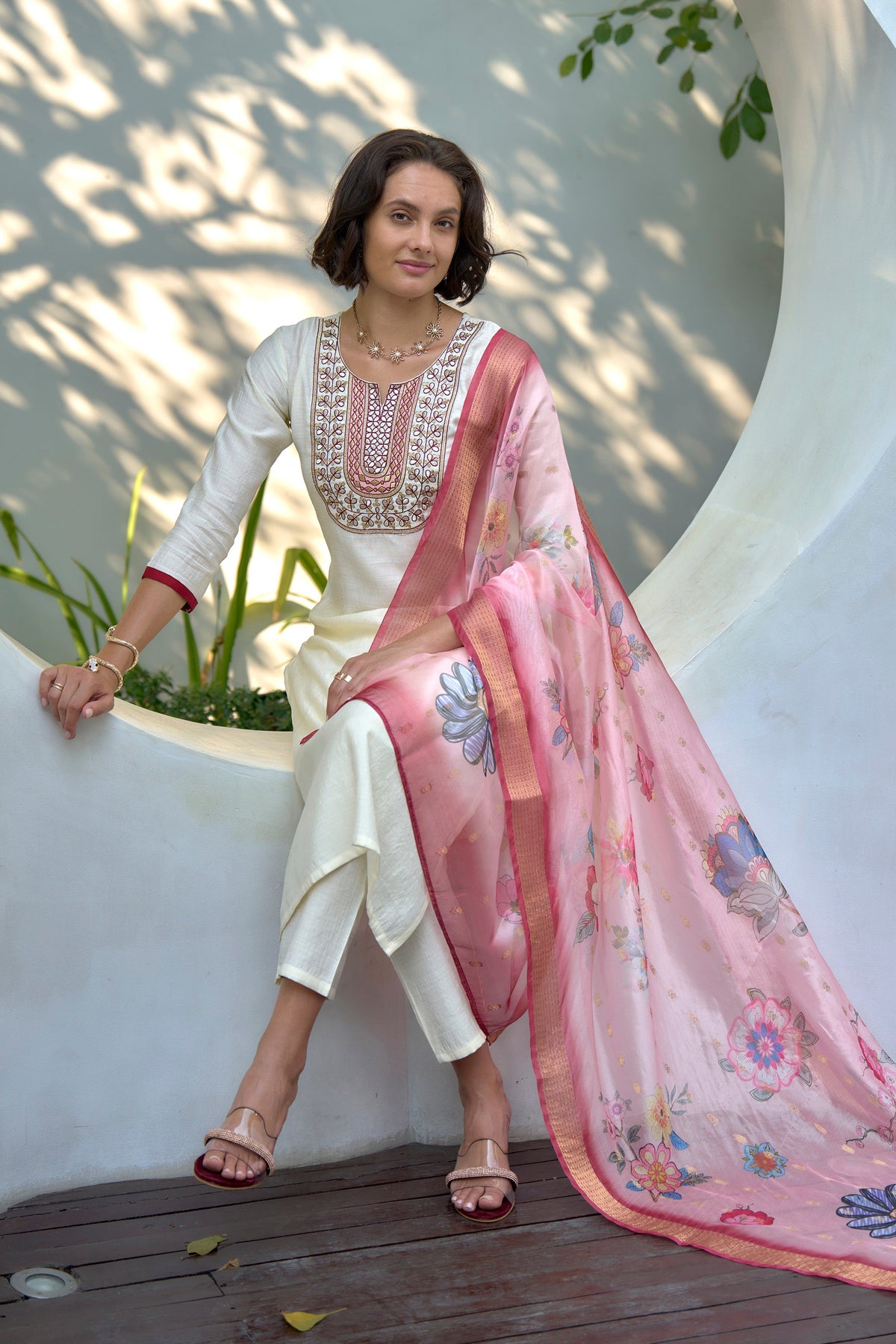 Cream Embroidered Neck Vatican Kurti Set with Organza Butti Dupatta