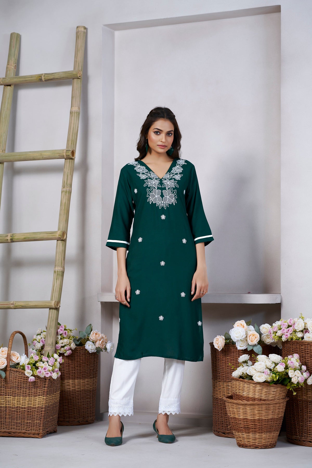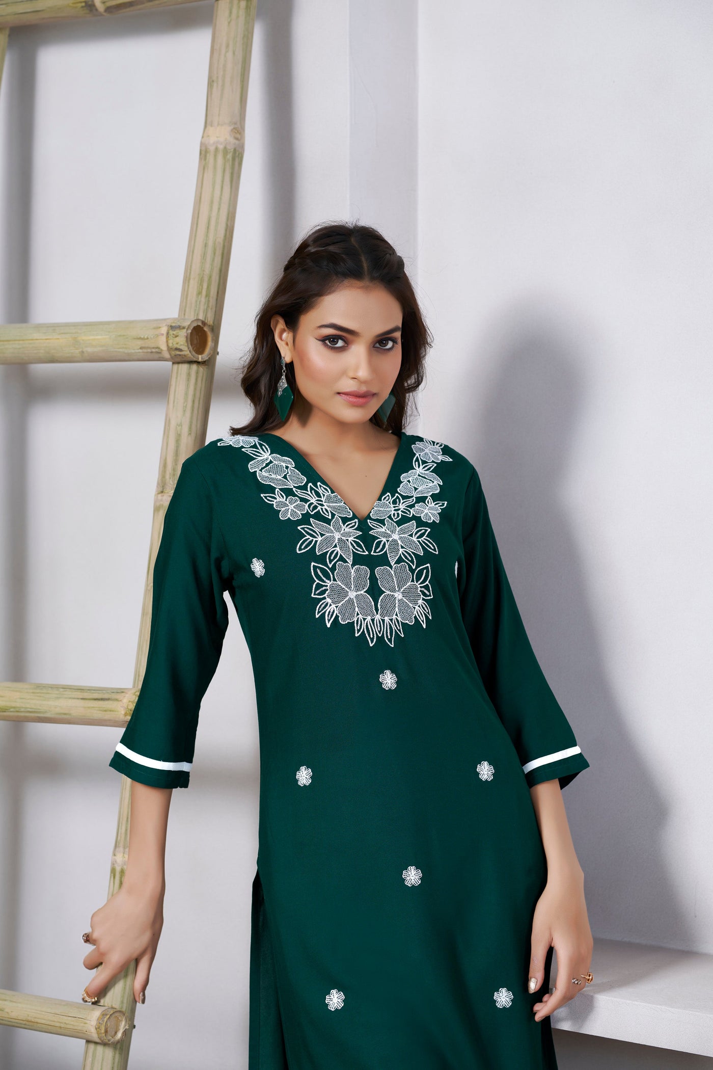 Green Viscose Rayon Kurti with Thread Work and 3/4 Sleeves with Stylish Neckline